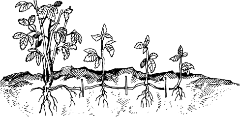 5. Размножение верхушечными отводками (рис. 27), особенно часто использующийся для укоренения ягодных кустарников, например малины, ежевики: