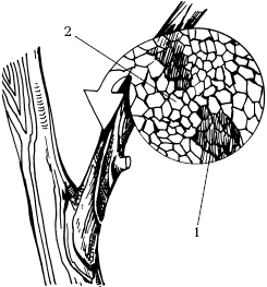 Рисунок 30. Срастание тканей растений: 1) прослойка из мертвых тканей; 2) проникновение и врастание ткани подвоя в ткани привоя