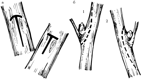 Рисунок 38. Подготовка к окулировке: а — выполнение поперечного надреза; б — срезание щитка: 1) неправильно; 2) правильно