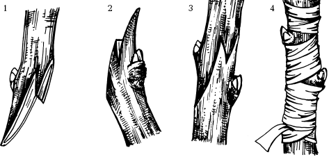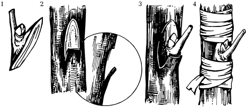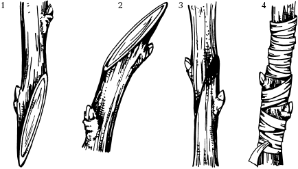 Рисунок 40. Прививка простой копулировкой: 1) срез на привое; 2) срез на подвое; 3) совмещение привоя с подвоем; 4) обвязка