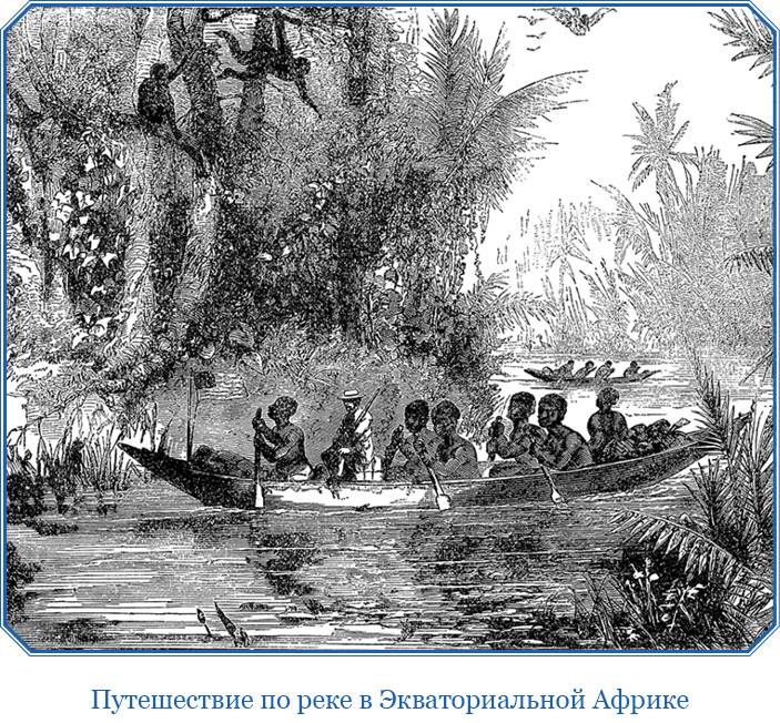Из деревни вождя Бамби, племени баналийцев, мы тронулись в путь водой и сухим путем 15-го числа и направились к селениям бунгангетов. Утро туманно и пасмурно, тяжелые облака нависли низко. Я смотрел на темную реку, бесшумно катившую свои воды между двух зеленых стен, служивших ей высокими и неприступными оградами, и думал, что эта местность благоговейно ожидает трубного гласа цивилизации, которая и ее призовет в свою очередь послужить общему делу человечества.