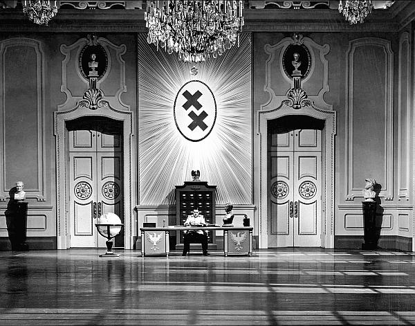 В сатире Чарли Чаплина “Великий диктатор”, где он играет выжившего из ума Аденоида Хинкеля, прием приближенных происходит в огромном зале, за гигантским письменным столом, а над головой диктатора висит огромный флаг с двумя черными крестами в круге – символ партии “Сыновья и дочери Двойного креста”. От него расходятся в разные стороны лучи солнца. Вышедший в 1940 году фильм во многом оказался пророческим.