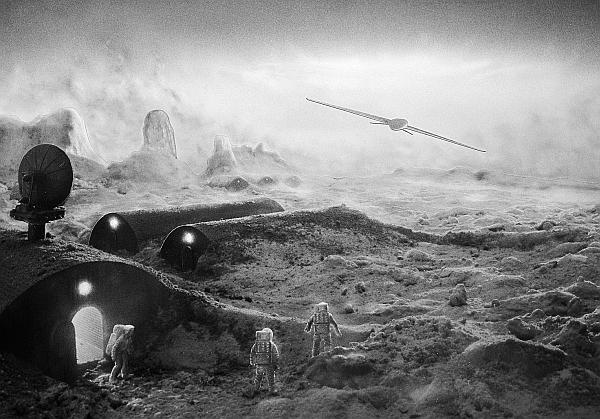 Обитаемая база на Марсе в воображении художника, смоделированная по образцу подобных баз на Антарктиде. Художник поместил лагерь в средоточие бушующей марсианской пылевой бури, соответствующим образом направив зловещий и мрачный свет (Julian Baum / Science Photo Library)