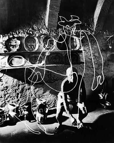 Фотограф журнала Life Гьен Мили побывал в гостях у Пабло Пикассо и показал ему несколько фотографий конькобежцев с маленькими лампочками на коньках, подпрыгивающих в темноте. Вскоре Пикассо стал использовать небольшой фонарик в темной комнате (Gjon Mili / Time Life Pictures / Getty Images)