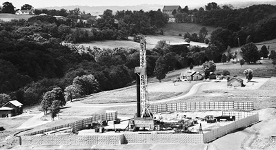 Джордж Митчелл отмечает сдачу в эксплуатацию 3000 скважины в северной части Техаса. Его настойчивость привела к революции на рынке сланцевого газа. На скважины для добычи сланцевого газа, такие как эта в Пенсильвании (нижнее фото), сегодня приходится четверть поставок природного газа в США