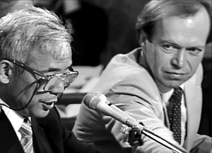 День сенатских слушаний по вопросу глобального потепления, организованных сенатором Тимом Уиртом, 23 июня 1988 г., стал одним из самых жарких в году. Выступление Джеймса Хансена (справа), по словам одного из пионеров моделирования климата Сюкуро Манабе (слева), «произвело эффект разорвавшейся бомбы»