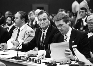 Во время предвыборной кампании 1988 г. Джордж Буш-старший пообещал противопоставить парниковому эффекту «эффект Белого дома». Однако во время саммита «Планета Земля» (Рио-де-Жанейро, 1992 г.) Буша (в центре) и руководителя Агентства по охране окружающей среды Уильяма Рейли (справа) СМИ называли «Дартом Вейдером» и «Сатаной»