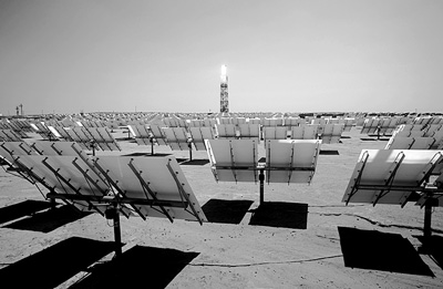 Солнечная установка башенного типа, где под действием сконцентрированного с помощью зеркал солнечного света генерируется перегретый пар, который приводит в движение турбину и генератор