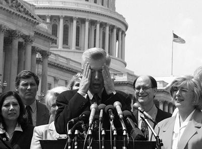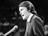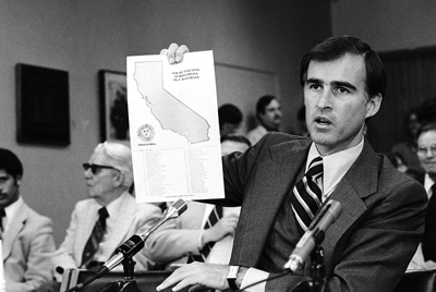 Губернатор Джерри Браун, запечатленный здесь во время выступления на сенатских слушаниях по вопросу возобновляемых источников энергии в 1979 г., положил начало ветровой энергетике в Калифорнии