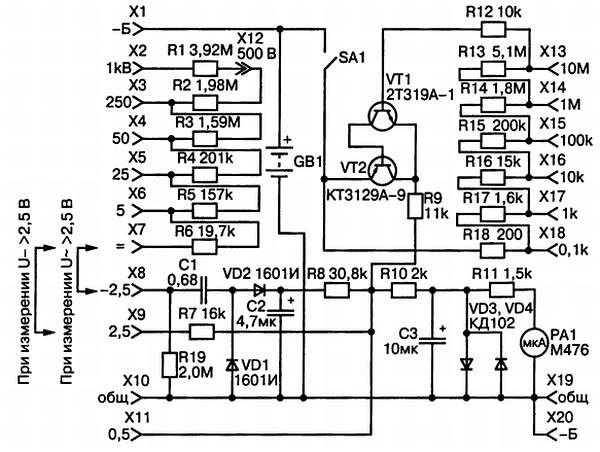 Для измерения переменного напряжения схема содержит выпрямитель с удвоением напряжения, собранный на диодах VD1 и VD2 и конденсаторах С1 и С2. Для отклонения стрелки микроамперметра на всю шкалу при подаче на клемму Х9 эффективного значения переменного напряжения 2,5 В используется добавочный резистор R8. Для измерения напряжений, превышающих 2,5 В, используется перемычка между клеммами Х8 и Х7 и те же клеммы Х2-Х6, что и при измерениях постоянных напряжений, с теми же пределами измерений.