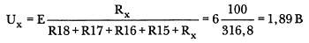 Если сопротивление резистора Rx составляет, например, 100 кОм и он подключен к клемме Х15, к батарее GB1 оказывается присоединено последовательное соединение резисторов R18, R17, R16, R15 и Rx. При этом падение напряжения на резисторе Rx оказывается равным: