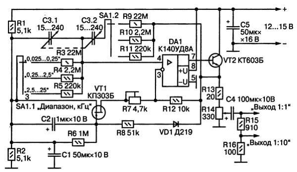 Генератор собран по классической схеме с использованием моста Вина на операционном усилителе DA1 типа К140УД8А. Выход микросхемы (вывод 7) подключен к базе транзистора VT2, который используется в схеме эмиттерного повторителя, нагруженного резисторами R13 и R14. С эмиттера транзистора сигнал поступает на неинвертирующий вход операционного усилителя (вывод 4) через мост Вина. Последовательное плечо этого моста образовано резистором R9, R10 или R11 и конденсатором С3.2, а параллельное плечо — резистором R3, R4 или R5 и конденсатором С3.1. По этой цепи осуществляется положительная обратная связь, благодаря которой происходит генерация синусоидальных колебаний такой частоты, на которую настроен мост Вина. Эта частота определяется произведением сопротивлений резисторов моста на емкости конденсаторов: