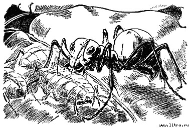 Довольно ловко муравей взобрался по стволу дерева на гигантский лист. Я полез за ним на нижний лист — на большое, мохнатое, слегка покачивающееся полотнище. Возможно, это лопух. Запрокинув голову, я увидел, как, тесно прижавшись друг к другу, приникли к нижней поверхности листа травянисто-зеленые толстенькие животные. Иногда одно из них повисало на шести слабеньких, тоненьких ножках, а затем снова прижималось к листу и упирало свой острый длинный хоботок в его сочную мякоть.