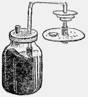 Итак, обычная трехлитровая стеклянная банка с пластмассовой крышкой, исколотой многочисленными отверстиями для вентиляции гнезда (шильце для этого можно сделать из обычной иголки). В крышке сделаны также два отверстия побольше. Одно служит для увлажнения муравейника и заткнуто палочкой; во второе вставлена стеклянная трубка (я ее в шутку называю муравьепроводом). Для этой цели лучше всего подойдет трубка из легкоплавкого стекла (она продается в аптекарских магазинах), легко гнущаяся в пламени газовой плиты или спиртовки. Трубка муравьепровода изогнута в виде буквы П. Отрезок этого П, входящий в банку, короткий (сантиметров пять); на конце снабжен муфточкой из резиновой трубки, срезанной с наружного конца косо, — это вход в муравьепровод. Он находится на поверхности земли внутри банки. Узнав о назначении входа, муравьи закладывать его не станут. Горизонтальный участок трубки в длину сантиметров 8-10. Такой же длины и нисходящий отрезок П. Он тоже снабжен резиновой муфточкой, у которой заткнут конец, но сбоку вырезано отверстие — выход из стеклянного туннеля. Впрочем, если не найдется резиновой трубки, можно склеить насадки из нескольких слоев бумаги. Чуть ниже бокового отверстия (выхода) горизонтальный картонный кружок диаметром 6 сантиметров; он имеет в центре отверстие, которым насажен на низ муфточки, как раз под входом. Стеклянное П вставляется коротким концом в крышку банки так, чтобы картонный диск отстоял от наружной стенки формикария на палец, иначе муравьи перелезут на банку и разбегутся по комнате. Чтобы лазиусы не скользили и не падали внутри стеклянного муравьепровода, в трубку следует подышать и тут же всыпать шепотку муки. Частицы ее прилипнут к стенкам и присохнут — вполне достаточная опора для цепких муравьиных лапок.