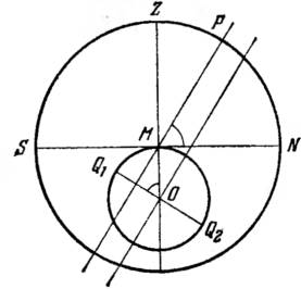 В самом деле, обратимся к рис. 11. На нём представлена проекция на плоскость чертежа земного шара и небесной сферы, соответствующей положению наблюдателя в точке М, при этом ось вращения Земли располагается в плоскости чертежа. Линия OZ есть отвесная линия для данной точки, линия NS — проекция на плоскость чертежа плоскости горизонта. Линия МР — направление на полюс мира, соответствующее точке М, которое из-за удалённости полюса мира практически можно считать параллельным оси вращения Земли. Угол Q1OM есть географическая широта точки M(Q1Q2 — экватор Земли), а угол NMP — высота полюса мира над горизонтом.