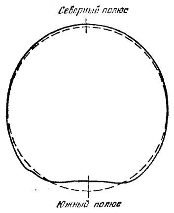 Но двухосный эллипсоид — лишь одно из первых приближений к истинной, очень сложной форме нашей планеты, получившей название геоида. Геоид — это та форма, которую имела бы Земля, если бы она была сплошь покрыта водой. В последние годы, в особенности благодаря наблюдениям с искусственных спутников Земли, наши знания о геоиде значительно расширились и уточнились. На рис. 12 сравнивается фигура геоида (сплошная линия) с фигурой эллипсоида. Как видно на этом рисунке, южный полюс «вдавлен» примерно на 30 м.
