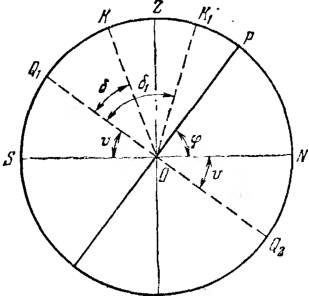 Рассмотрим сечение небесной сферы, при котором плоскость небесного меридиана совпадает с плоскостью чертежа (рис. 13). Здесь ОР — ось мира, NS — проекция плоскости горизонта, Q1Q2 — проекция плоскости небесного экватора, угол — высота полюса мира над горизонтом, равная широте данного места, угол — высота точки пересечения Q1 плоскости небесного экватора с небесным меридианом (иными словами, угол наклона плоскости небесного экватора к плоскости горизонта).