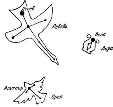 Рис. 16. Рисунки созвездия Лиры, Лебедя и Орла.