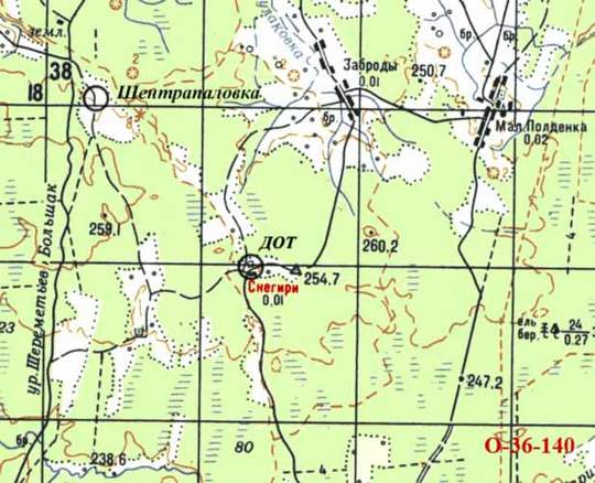 На "современной" карте отмечено положение деревни Шентрапаловка у заросшей дороги "урочище Шереметьев Большак". Автор, когда писал, имел под рукой только 5-и километровку образца 41-го года, по этому координаты указанные в рукописи следует считать условными. Орудийный ДОТ стоит в 3-х км юго-восточнее Шентрапаловки, это Снегири. ДОТ расположен примерно в 500 метрах западнее геодезической отметки 254,7. В устных рассказах, автор упоминал гео-вышку.