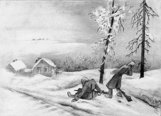 По глубокому снегу трудно идти. Узкую снежную тропу в снегу пробиваем по очереди. Старшина Сенин с тремя солдатами идёт впереди, я и мой ординарец шагаем чуть сзади. За нами следом извилистой змейкой тянется рота. Прокладывая путь, старшина и солдаты обходят завалы, занесенные снегом бугры и овраги. Часа через два мы останавливаемся. Впереди сквозь ели виден узкий просвет. Осторожно подвигаясь вперёд мы выходим на укрытую снегом дорогу. Дорога ни разу не чищена, занесена, как и всё кругом, глубоким снегом в лесу. Снег лежит нетронутым и толстым слоем. Никаких следов на дороге не видно. Дорога заброшена, по ней не ездили даже в начале зимы.