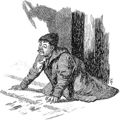 Между тем черт крался потихоньку к месяцу и уже протянул было руку схватить его, но вдруг отдернул ее назад, как бы обжегшись, пососал пальцы, заболтал ногою и забежал с другой стороны, и снова отскочил и отдернул руку. Однако ж, несмотря на все неудачи, хитрый черт не оставил своих проказ. Подбежавши, вдруг схватил он обеими руками месяц, кривляясь и дуя, перекидывал его из одной руки в другую, как мужик, доставший голыми руками огонь для своей люльки; наконец поспешно спрятал в карман и, как будто ни в чем не бывал, побежал далее.