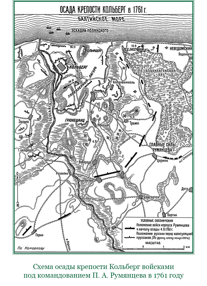И так я генерала-квартирмейстера лейтенанта князя Вяземского немедленно для договору к генералу-майору Кноблоху отправил, а 14-го числа, по заключении капитуляции, весь деташемент в присутствии моем с барабанным боем в Кольбергские ворота вышел, ружья, и знамена, и оружейные вещи положил и вашего императорского величества военнопленными учинен. Генерал-майор Кноблох за сущей болезнью при сем за дозволением моим не был. Во все же бомбардирование неприятель весьма мало со стороны своей стрелял, видно, что свою артиллерию при опасных ему местах в средине города при сущей атаке к употреблению сберегал.