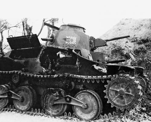 Средний танк «Чи-ха» подбитый огнём американских 37-мм противотанковых пушек на о. Гуадалканал в октябре 1942 года.
