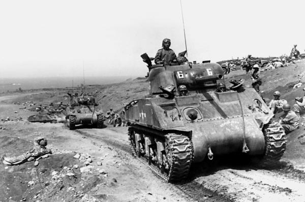 Танки М4А2 3-го танкового батальона корпуса морской пехоты США. Иводзима, февраль 1945 года.