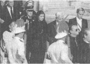 Князь Монако Ренье III в сопровождении Каролины и Альберта на похоронах принцессы Грейс