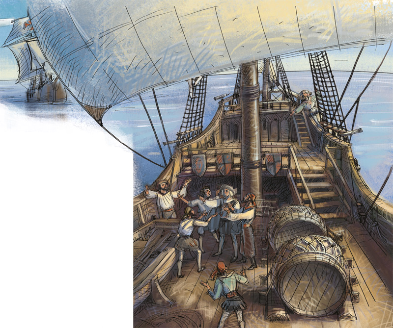 – Гребцы здесь не нужны! Каравеллы плывут, используя только силу ветра. Эти корабли имеют по три высокие мачты, которые несут большие паруса. С помощью парусов моряки могут хорошо управлять движением судна.