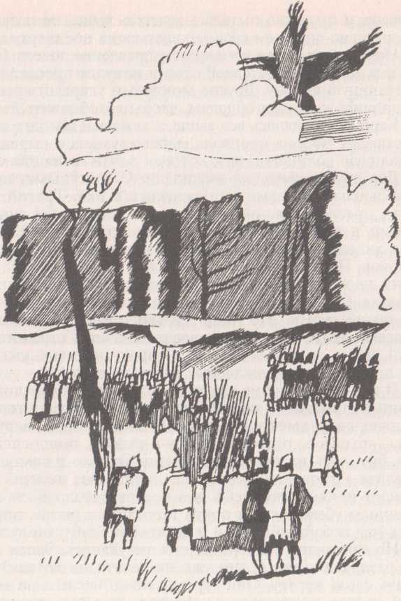 Карр перелетела еще ближе и замерла. Один из Охотников — грубый воин, одетый в медвежью шкуру,— заметил птицу. Жестоко усмехаясь в предвкушении развлечения, он потянулся к своему луку. Быстро прицелившись, он выпустил стрелу. Но, несмотря на то, что движения Охотника были привычно быстрыми и точными, острый глаз вороны ухватывал каждое его движение йа какую-то долю мгновения раньше. Карр захлопала крыльями и легко увернулась от просвистевшей стрелы, которая глубоко вонзилась в толстый сук совсем рядом с ее головой. Охотник с проклятиями по поводу мерзкой вороны и впустую пропавшей стрелы собрался уже выстрелить вновь. Но довольная собой Карр с