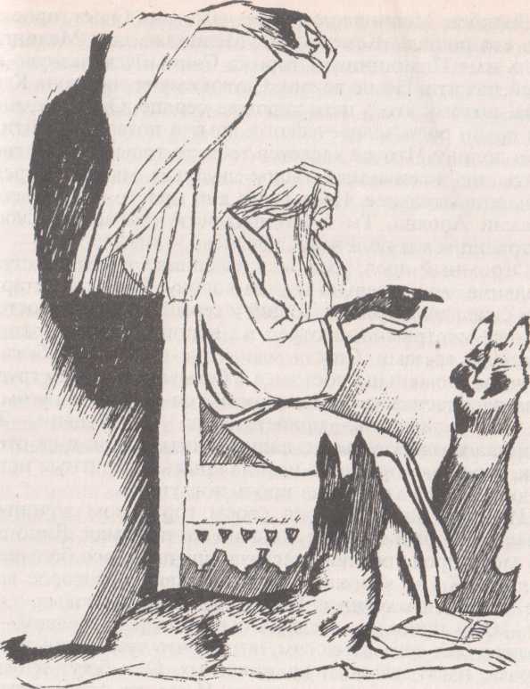 Огромный орел, усевшись на спинке тяжелого стула Медвина, внимательно изучал ворону. Рядом со стариком сидел волк Бринач. Тощий и серый, он вилял хвостом и тоже неотрывно смотрел на ворону своими узкими желтыми глазами. Спустя мгновение в комнату вбежала волчица, поменьше ростом и с белым пятном на груди. Она распласталась на полу рядом со своим супругом.