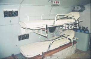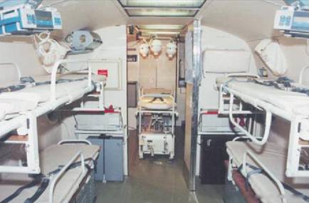 Здесь же располагается и универсальный стол на колесах, который может свободно перемещаться по операционному и реанимационному отсекам, а с помощью специальных направляющих его можно выкатить через задний люк, положить на него больного и доставить на борт вертолета. Здесь этот стол устанавливают на упоры, поднимают и поворачивают до наиболее удобного для проведения операции положения. После операции больного перевозят на этом же столе в реанимационный отсек.