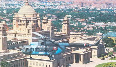 Свыше 150 вертолетов Ми-8 и Ми-17 различных модификаций находятся на вооружении ВВС Индии. Из них сформировано почти 15 эскадрилий. Показанный на фото вертолет Ми-8 входит в состав 115-й вертолетной эскадрильи, базирующейся в Джодхпу- ре. Он запечатлен в момент полета над дворцом Умаид Бхаван