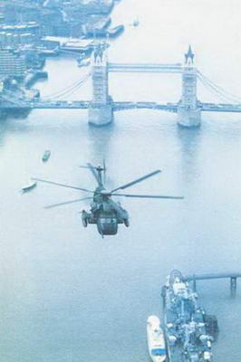 На фоне лондонского Тауэр-Бридж пролетает вертолет НН-53С. В течение двух десятилетий в Великобритании постоянно присутствовали поисково-спасательные машины НН-53С и MH-53J. Они размещались на авиабазах в Вудбридже, Бентуотерсе, Злконбери и Милденхолле