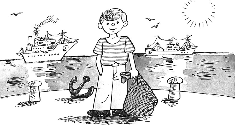 Поезд проскочил сквозь дымный, как печка, тоннель, промчался под громадной скалой и остановился перед похожим на сказочный терем вокзалом. Слева по перрону бежали, толкаясь, пассажиры, покрикивали носильщики. А справа, среди залива, тянулись к небу десятки мачт, упирались в причал чернобокие корабли. А над заливом кувыркались чайки.