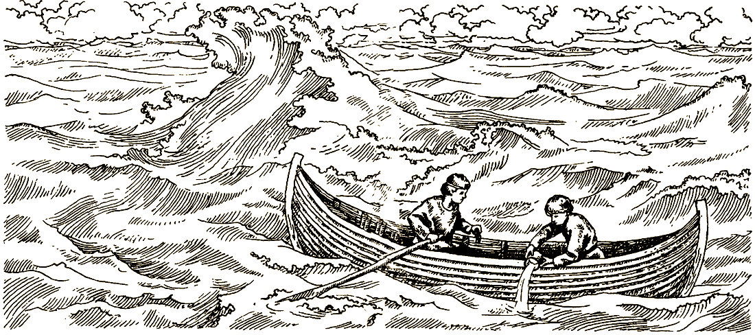 От усталости ты засыпаешь. Тебя будит порывистый ветер и дождь. Свейн по-прежнему гребет, стараясь направить лодку по ветру. Начинается короткая летняя ночь. Небо становится черным как смоль, ветер свирепеет, дождевые капли покалывают твое лицо, точно иглы.