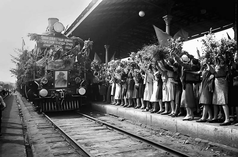 Встреча первого эшелона с воинами-победителями на Белорусском вокзале в Москве. Май 1945 г.