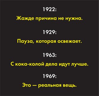 Стоит отметить, что, постоянно используя этот «визуальный молоток», Coca-Cola неоднократно предлагала все новые «вербальные гвозди» – тексты, которые он должен был закреплять. За последние 107 лет она сменила 57 рекламных слоганов – и большинство из них потребители практически сразу успешно забывали. Так же, кстати, произошло и с девизом 1941 года – «Coca-Cola – это кока!».
