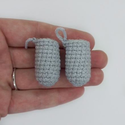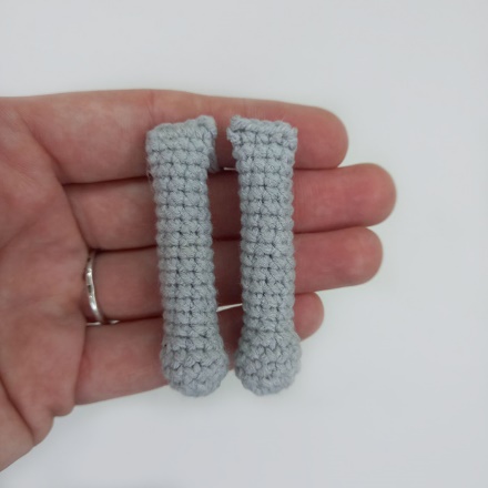 Примечание: на одной ноге нить нужно обрезать, оставив небольшой кончик для заправки, а на второй ножке нить не обрезаем. Далее будем продолжать ею вязать, соединив ножки и перейдя к вязанию тела