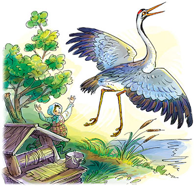 И такой умница! Как только услыхал он это наше «фру-фру», сейчас мах-мах крыльями и прилетел. Тут уж жена себя не помнит от радости, велит ребятам бежать скорее за лягушками. В этот год лягушек было множество, ребята скоро набрали два картуза. Принесли ребята лягушек, стали давать и считать. Дали пять — проглотил, дали десять — проглотил, двадцать, тридцать, да так вот и проглотил за один раз сорок три лягушки.