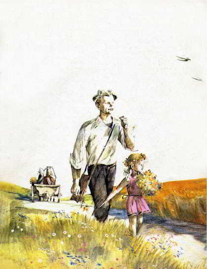 — До свидания, — улыбнулся глазами сторож. — Я не знаю, куда вы идете и чего ищете, но только знайте: самое плохое для меня далеко — это налево у реки, где стоит наше старое сельское кладбище. А самое хорошее далеко — это направо, через луг, через овраги, где роют камень. Дальше идите перелеском, обогните болото. Там, над озером, раскинулся большущий сосновый лес. Есть в нем и грибы, и цветы, и малина. Там стоит на берегу дом. В нем живет моя дочь Валентина и ее сын Федор. И если туда попадете, то от меня им поклонитесь.