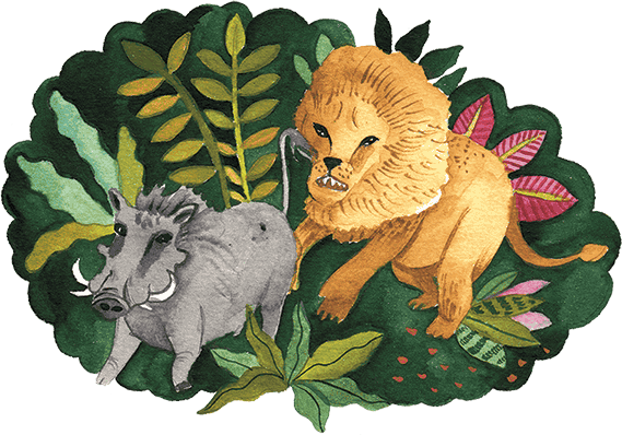 Грозно взревел Лев, да как прыгнет на Бородавочника! Бородавочник понял, что он наговорил лишнего, выскочил из болота так быстро, как ноги несли. Он улепётывает, а Лев за ним, да с рёвом, да с рыком, не отстает, вот-вот догонит и в клочья порвёт! Бородавочник в логово своё нырнул, облегченно вздохнул, пулей прыгнул на кровать – а там Дикобраз устроился спать! Врезался Бородавочник прямо в Дикобраза и получил тысячу иголок сразу! Волей-неволей, вылез он на свет, завывая от боли.