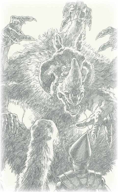Злая Колдунья выглянула в окно, увидела, что все вороны мертвы, и пришла в страшную ярость. Она призвала дюжину своих рабов-Мигунов, дала им острые копья и велела убить чужаков.