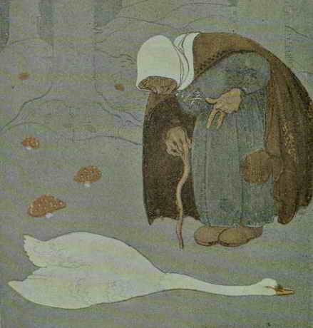 А случилось вот что: пока юные принцессы резвились в воде, оперение младшей нашла старая крестьянка и отнесла к себе в избу, что стояла на лесной опушке.