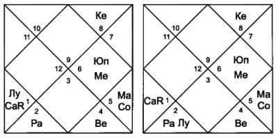 Только хозяин 1-го дома Юпитер и хозяин 7-го и 10-го дома Меркурий, объединены раджа-йогой. В 10-м доме Лагнеша Юпитер и Меркурий в экзальтации. Меркурий, который впитывает энергию планеты, с которой он рядом, тут принимает природу Юпитера и становится благоприятной планетой.