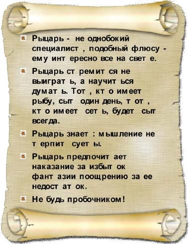 На сцену выходят восемь групп ребят. Своих «воинов» выставили отряды физиков, искусствоведов-этнографов, математиков, биологов, химиков, техников, астрономов и геологов. Нет только группы отряда РТВ – было бы несправедливо пускать в бой ребят, специально обучающихся решению хитрых задач, против необученных. Но зато в каждой группе есть «играющий тренер» из старичков отряда РТВ. У каждой группы свой герб: у химиков – колба, из которой, усмехаясь, вылетает джинн, у биологов – головка ромашки, у астрономов – хвостатая комета с игривой рожицей, танцующий робот у техников, человечек с рюкзаком у геологов. Появляется распорядитель – старший судья турнира. Он разворачивает свиток и торжественно зачитывает слова рыцарской клятвы:
