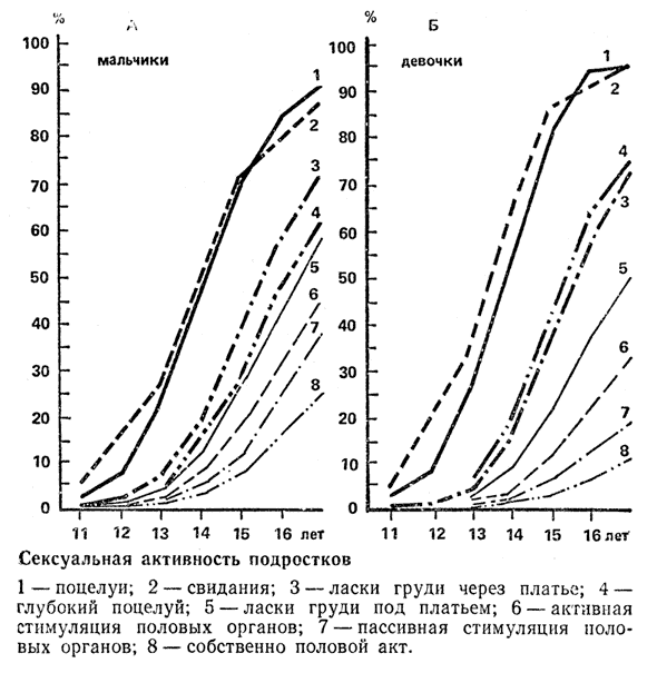 Начало половой жизни. Хотя, как говорят, «лучший способ половой жизни молодежи — воздержание», сами молодые люди так не думают. Больше того, начало половой жизни часто притягательно именно как посвящение во взрослого человека и объективно нередко становится крайним выражением эмансипационных мотивов. В сложном мотивационном комплексе начала половой жизни называют также любовь, потребность в доверительном общении, любопытство, настояния партнера, сексуальный импульс, пример сверстников, совращение, а в юношеском возрасте — конформность, потребность «быть как все». А. Г. Харчев и С. И. Голод нашли, что чем меньше возраст, тем меньше значит любовь как мотив начала половой жизни: до 16 лет — 14,2%, в 16—18 лет — 15,8%. М. Скоффилд считает, что у мальчиков ведущий момент — любопытство, а у девочек — любовь. А. Тавит и X. Кадастик при опросах молодежи в Эстонии в конце 70-х гг. нашли, что любовью мотивировали первую близость чаще девушки: до 15 лет — 25% при 15% юношей, в 16—17 лет — 42,6 при 20,5%. Любопытство же преобладало у юношей: до 15 лет — 55% при 12,5% у девушек, в 16—17 лет — 41% при 31%. То же касается и физической потребности: до 15 лет — 5% у юношей, в 16—17 лет — 16,4% у юношей и 1,6% у девушек. Настояния партнера были для девушек несколько более значимым мотивом: до 15 лет — 25% при 15% у юношей, в 16—17 лет — 21% при 19,2%. В числе других мотивов они называют сострадание, совращение, насилие и экономические соображения (у 5% мальчиков до 15 лет и 25% девочек того же возраста и у 1,6% 16—17-летних). По их данным, у 10% женщин и 25% мужчин первая близость происходила на фоне алкоголизации, а у младших подростков эта цифра достигала 38,4%. По данным М. Скоффилда, аналогичные показатели для мальчиков (юношей) составляли 3% и для девочек (девушек) — 9%. Есть мотивы, расцениваемые как «женские», но являющиеся по сути коммуникативными: доказательство любви, доверие как к будущему супругу, сочувствие заявлениям о тяжести воздержания, страх лишиться партнера, проверка своей «ценности».