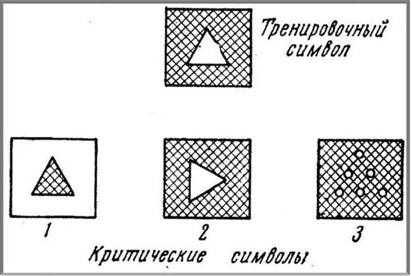 Прежде чем перейти к описанию перцептивных операций и действий, следует остановиться на вопросе о критериях восприятия. Несмотря на то, что довольно детально разработаны некоторые критерии восприятия и создана совершенная техника их обнаружения и измерения, вопрос об их адекватности остается открытым. Так, например, в исследованиях, ведущихся по условно-рефлекторным методикам, возникновение положительной реакции или выработка дифференцировки нередко принимается за показатель адекватного восприятия. Хебб приводит данные экспериментов Лешли и др., в которых обнаружились разные степени восприятия «треугольности» [24] . Крыса, у которой была выработана реакция на белый треугольник на черном фоне, дает случайные ответы на другие варианты треугольника (1, 2, 3) (рис. 3–1).