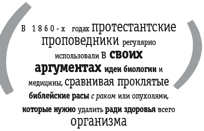 Уже по крайней мере в 1860-х годах протестантские проповедники регулярно использовали в своих аргументах идеи биологии и медицины, сравнивая проклятые библейские расы с раком или опухолями, которые нужно удалить ради здоровья всего организма. Так, в 1867 году популярный лондонский проповедник Джонатан Бейли говорил: